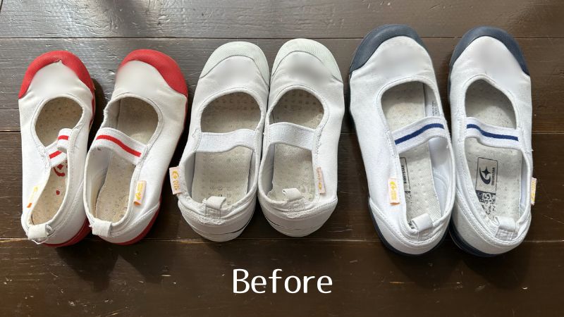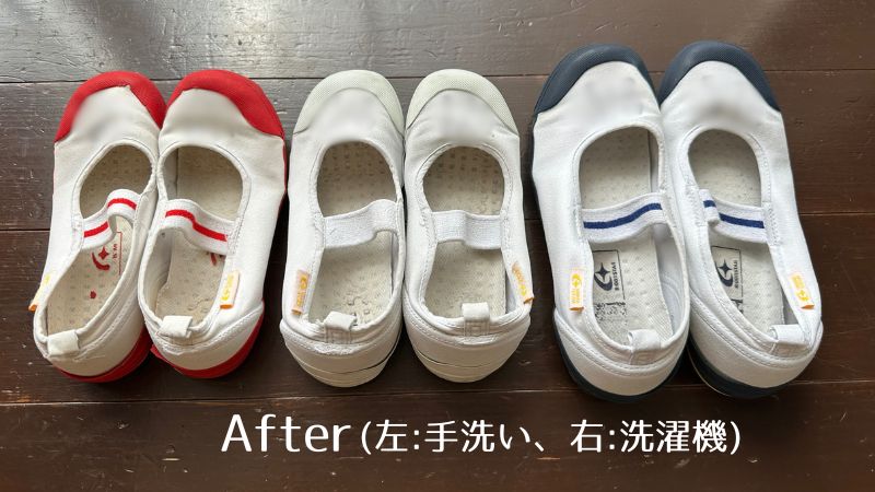 今回は、3人分の上履きを使って、手洗いと洗濯機洗いの違いを比較してみました。