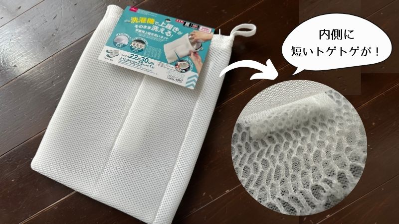 ネットの内側(片側)には短いトゲトゲ(ブラシ状の突起)がついていて、洗濯機の回転と一緒に汚れをこすり落としてくれる構造になっています。